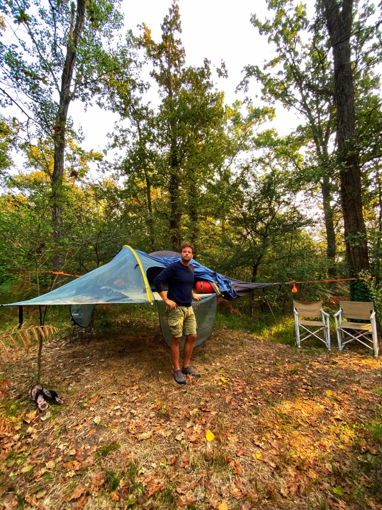 Se te lo stai chiedendo, è molto facile salire all’interno e dentro c’è spazio per tutto (zaini inclusi, noi avevamo uno zaino grande e un mini trolley). E sì, reggono perfettamente il peso! 😜 Ma veniamo al punto più importante: come si dorme in una tenda sospesa? Sicuramente al caldo, il sacco a pelo è decisamente servito; io avrei però preferito avere a disposizione anche una materassino e un cuscino, in quanto la tenda tirata tra gli alberi resta molto rigida e non essendo abituata ho fatto un po’ fatica a trovare la giusta posizione e ad addormentarmi… ma svegliarsi nel bosco con i suoni della natura e il sole che fa capolino tra gli alberi non ha prezzo. Ogni tenda è infine dotata di un paio di sedie all’esterno dove poter appoggiare eventuali borse o dove lasciare ad esempio le scarpe.